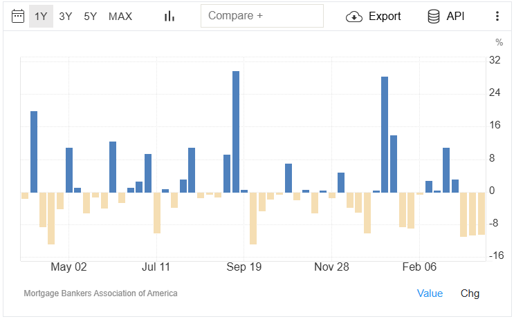 Keep in mind, too, that the NAR crisis quote was given in early February, and conditions for homebuyers have only deteriorated since then with a recent rise in interest rates. The chart below shows weekly changes in mortgage applications via the Mortgage Bankers Association (courtesy of Trading Economics). Mortgage applications were up four weeks in a row in February, but have subsequently declined by 10.9%, 10.5%, and 10.4% over each of the past three weeks (the three downward yellow bars on the far right of the chart):