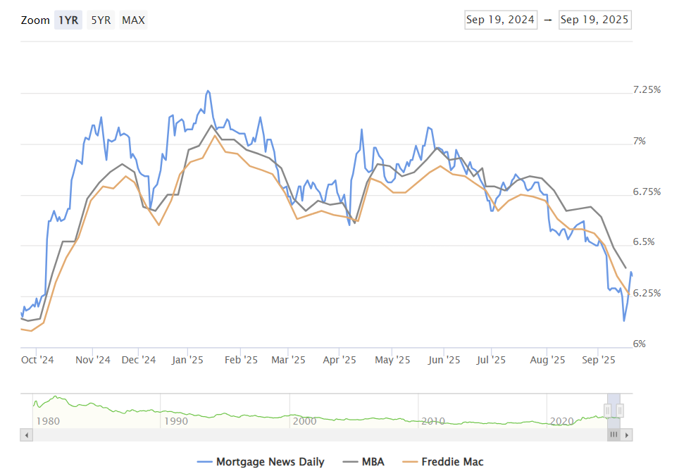 From people I talk to in the industry (realtors, title attorneys, mortgage brokers, etc.), the high-rate environment over the last two years has made things feel pretty much frozen in the residential market. Buyers have been on the sidelines, unable to make the math work on home purchases at high prices and with high interest rates. With mortgage rates now at their lowest point of 2025, will buyers come back? There is already some evidence that mortgage applications have been ticking up in the month of September, per data from the Mortgage Bankers Assocation, after a fairly anemic summer.
