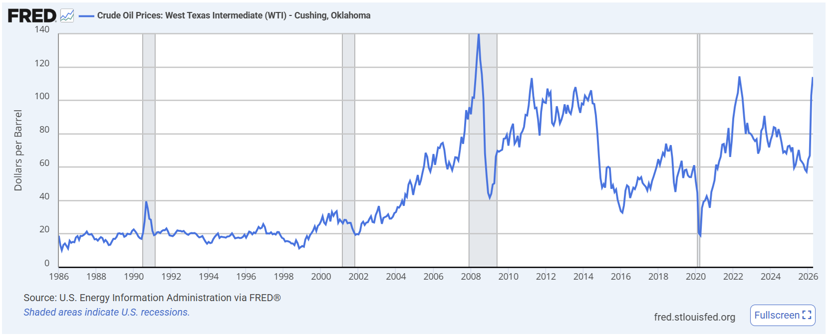 If you look at the chart for the price of oil, you can see just how notable these upswings have been (data is only available from this source going back to 1986, so the oil shocks of the 1970s are not shown):
