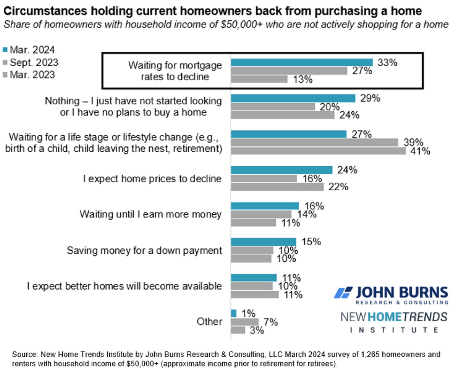 Via John Burns Real Estate Consulting, “Waiting for Mortgage Rates to Decline” has popped into the #1 spot of reasons why would-be homebuyers are waiting. Historically the top reason has been “Waiting for a Life Change” like having a baby or moving between cities: