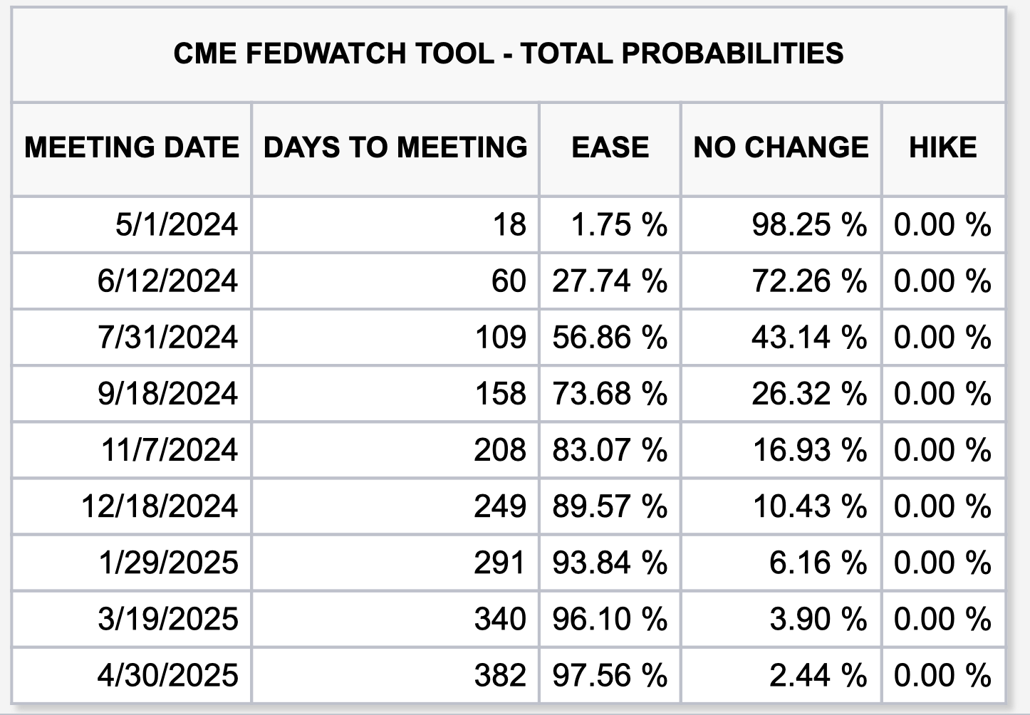 In December, I shared a table showing economists’ predictions for interest rates cuts. At the time, the odds of a May rate cut were nearly 97%:
