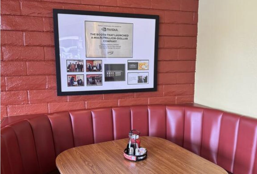 I don’t want to give away the whole story because the book is worth reading on its own. But one of my favorite bits: an early job that Nvidia CEO Jensen Huang (colloquially now known as just “Jensen”) had in his youth was as a waiter at Denny’s. In fact, the company was later founded during conversations between Jensen and his two co-founders, Curtis Priem, and Chris Malachowsky, during their conversations in a booth in the East San Jose Denny’s. Jensen is quoted in the book as saying he wanted to be the best waiter and busboy Denny’s had ever seen, and he thinks he probably was. Rather than shirk off the job, he says he used it to learn how to interact with customers, how to stay calm when things went wrong, and how important speed and efficiency were in delivering the product, all traits he would carry with him to Nvidia.