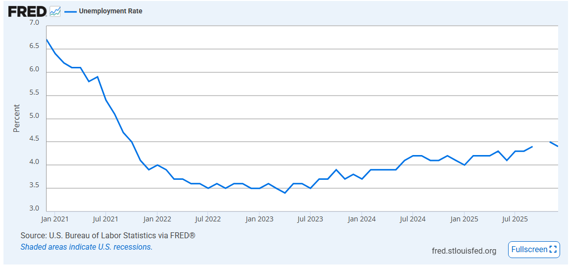 So where does the Fed find itself today? On one side of its mandate, the labor market (at least on paper) is moderately strong by historical standards. The December 2025 unemployment rate of 4.4% is not bad, although it has been ticking up for the past two years, slowly but steadily, as shown in the chart below: