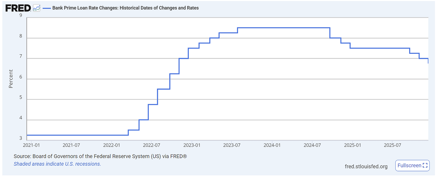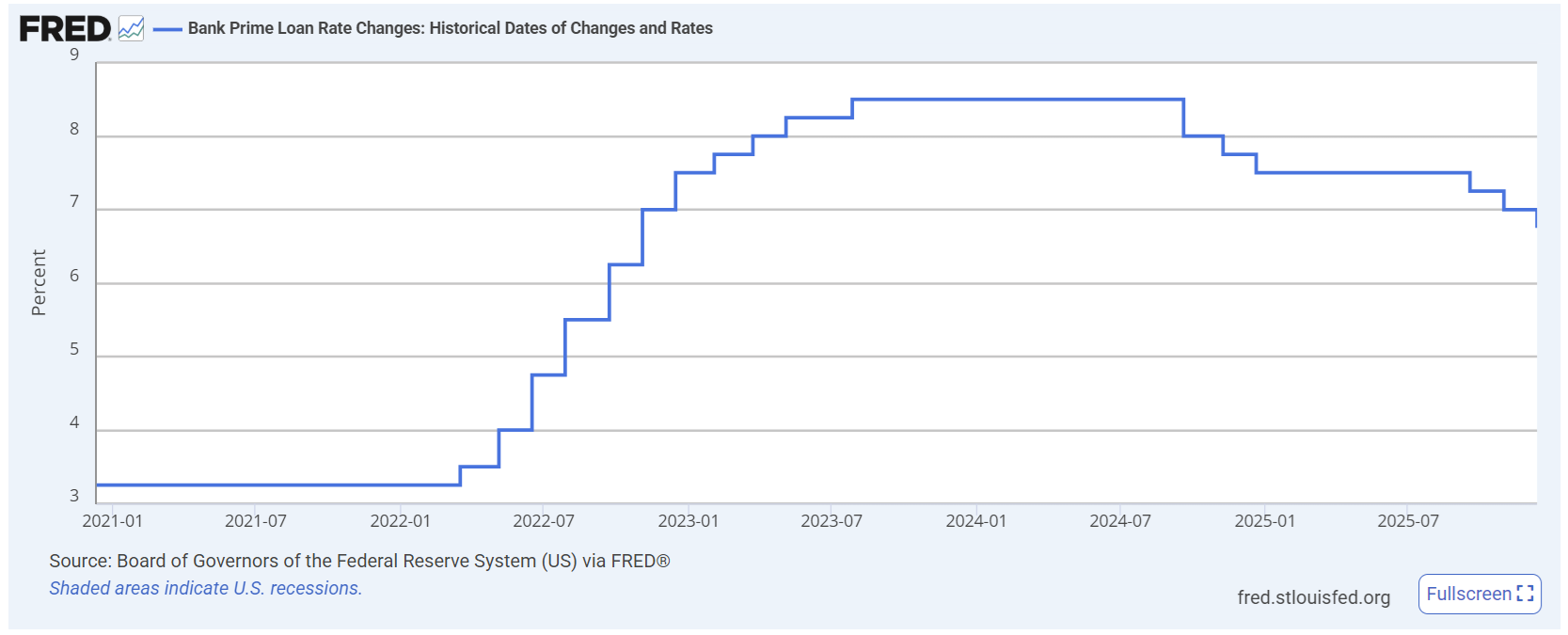 On the commercial side of the borrowing world, rates have also come down. Banks often peg their rates for business loans at a certain margin above a set index, such as the Secured Overnight Financing Rate (SOFR) or the Fed’s Prime Rate. These rates are not subject to the same degree of fluctuations as home loan rates, but the peaks and trajectories have been generally the same as those on the residential side over the past two years. These indexes (and therefore the commercial loans that they are priced around) generally peaked in the summer and fall of 2023, and then stayed elevated for a full year until the fall of 2024, when rates started to gradually step downward. The chart below shows the Prime Rate, which peaked at 8.50% and has since dropped to 6.75%. This means, generally speaking, that it is cheaper to borrow for a business loan today than it was from the summer of 2023 through most 2025: